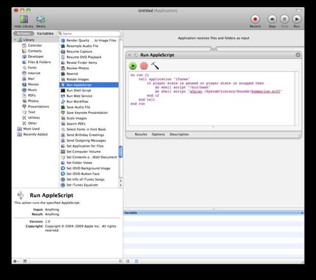 Arrastrar "ejecutar AppleScript" en el panel derecho, verá un cuadro con: