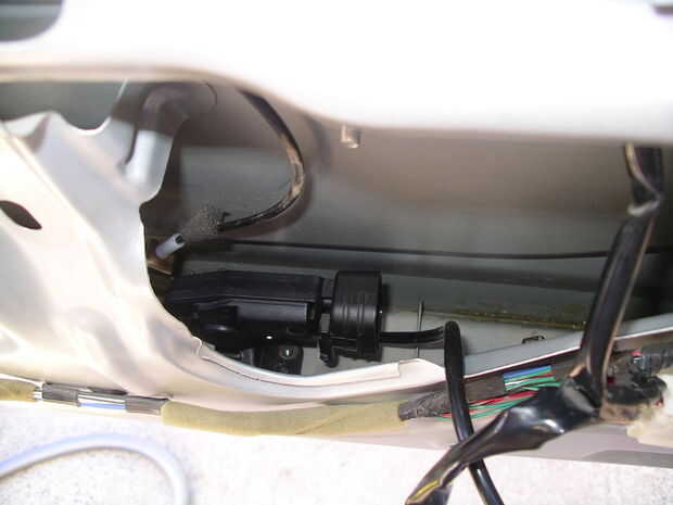 Que alguien Presione la manija exterior - el cable debe tirar una palanca en la cerradura de pestillo a la derecha. Trate de empujarla directamente para ver si puede mover aún más (el cable podría ser estirado o no conectado correctamente). Otra vez nada tan simple para mí.