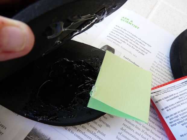 Usando la cartulina o los palillos, extienda el pegamento. Cubrir como uniformemente como sea posible. Utilizar palillos de dientes para las piezas apartes del apoyo y los de no tocar.
