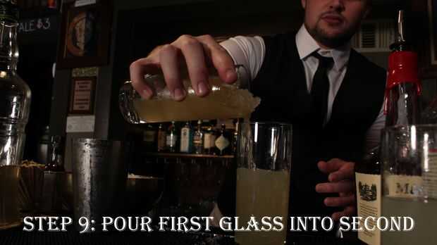 Este paso parece enrevesado, pero el que vierte la primera mezcla en el segundo es lo que crea la parte de la efervescencia de la fred fizz de Collins.