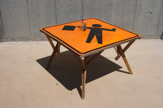 Recibí la señal de un depósito de chatarra que acostumbrados a conocer, al norte de Phoenix. Estaba libre. Te recomiendo "libre", en general, como va reducir el costo de este proyecto, así como (con suerte) algo reciclar alguien pensamiento era basura. Toda la madera que utilicé fue también gratis, barata madera contrachapada cortada en tiras, tablas viejas y otros surtidos, destrozados, pintadas, barnizadas, y pelando trozos de alrededor de la tienda he trabajado en. Los nuevos materiales son elementos de fijación. La mayor parte de mi trabajo es con "basura", y en el espíritu de los freeganos y readymakers por todas partes, intento pasar como poco dinero como sea posible. Además me ahorro algunos problemas, ahorrar dinero es a menudo una manera simple de salvar el medio ambiente, utilice menos mierda. La pintura descascarada y golpes en la muestra se convierten en parte integral de la estética.