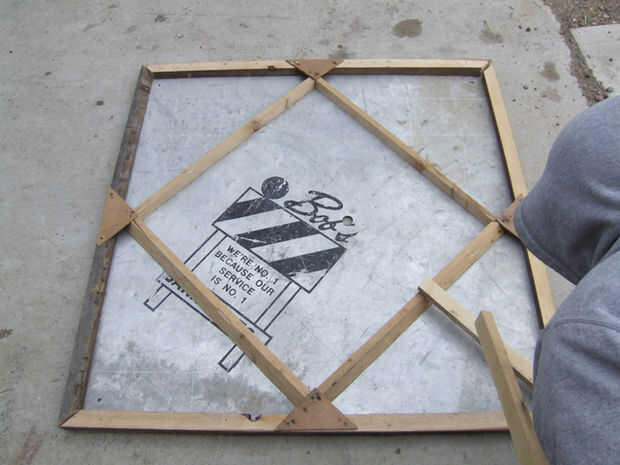 Luego conectas los puntos medios de los lados con unas tiras más de dos por cuatro. Hice algunos pequeños refuerzos triangulares para unir las diagonales a las piezas laterales. Éstos pueden hacerse de cualquier chatarra de madera, madera contrachapada, o delgada Chapa cortada en un 45-45-90 triángulo.