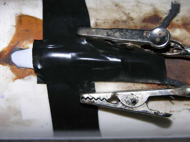 9. Asegúrese que las pinzas de cocodrilo o de no tocar y envolver un trozo de cinta aislante sobre todo y alrededor del tubo. Para asegurarse de que no desplazar los clips Pulse hacia abajo la cinta entre ellos, mantiene en su lugar.