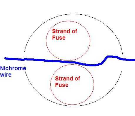 6. este paso es difícil de describir así que cheque la imagen, debe hacer sentido de las cosas. El diagrama muestra la vista como si se mirara en el agujero en la parte superior de la paja. Con las tijeras corta sobre un centímetro en los extremos opuestos de la paja. Dividir las 2 hebras del fusible hasta donde los los cortes en los cortes en el extremo de la paja. Poner un trozo de alambre de Nicromio entre los dos filamentos y hacia abajo, al llegar al paja tire los extremos del alambre del nicrom a través de los dos cortes que hiciste en la pajita.