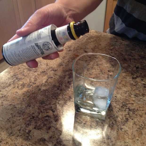 En un vaso con 2 cubos de hielo, agregar 2-3 toques de amargo, dependiendo de la preferencia.