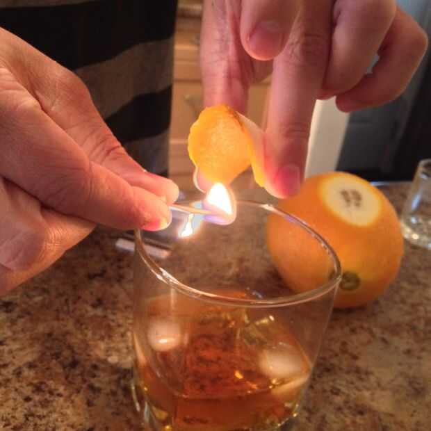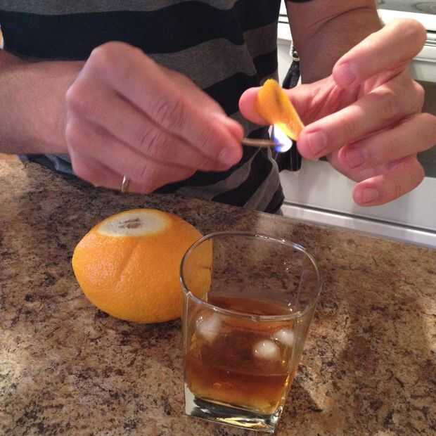 Primero necesita luz al partido coge entre dos dedos la piel de naranja y ligeramente dependiendo de su preferencia, quemarse o ennegrecer el exterior de la piel de naranja. Recomiendo no por queme la piel.