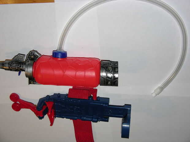 8. (funciona mejor en lugar oscuro, donde es fácil ver el chorro de la llama de la antorcha) luz y bloqueo de la antorcha. Ajuste la llama máxima configuración. Presione hacia abajo en la manguera recargar la botella. Presione hacia abajo con los 2 dedos para disparar a otra corriente de agua, sólo este vez Compruebe que está pasando a través de la llama. Si el agua pasa a través de la llama significa que se enciende cuando usted está usando un líquido inflamable, si no necesita ajustar el soplete en la muñeca para que la corriente de líquido pasa a través de él.