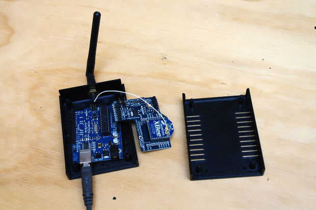 Cuando haya terminado, desconecte el USB, y vuelva a conectar el XBee shield. Usted también necesitará pantano detrás de los puentes de alimentación de Arduino.