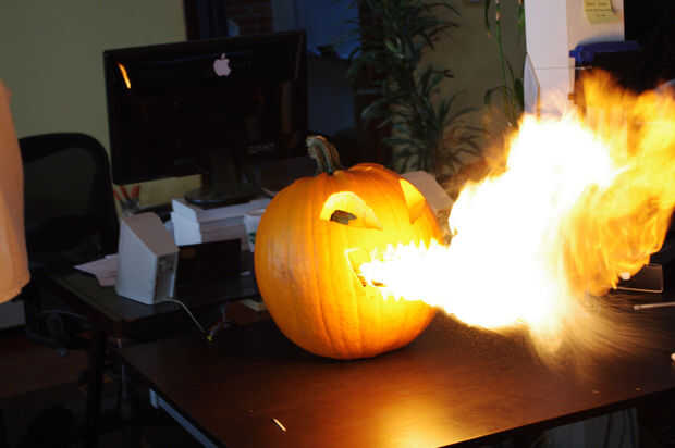 Tomar un número de manera pasos detrás de la calabaza y presione el disparador del transmisor. Si todo está bien con el mundo, la calabaza explosión una explosión de fuego infernal de su boca.