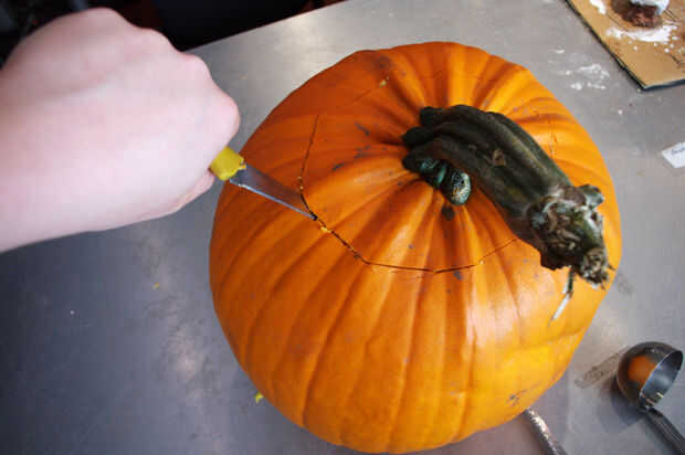 Corte alrededor del tallo de la calabaza en un ángulo (con el cuchillo inclinado en dirección del tallo de la calabaza)