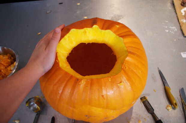 Usando una cuchara de metal u otro utensilio de raspar (encontré que un cincel funciona mejor) raspar los lados de la calabaza y retirar todas las tripas babosas. El interior debe ser razonablemente lisa y limpia cuando se realiza.