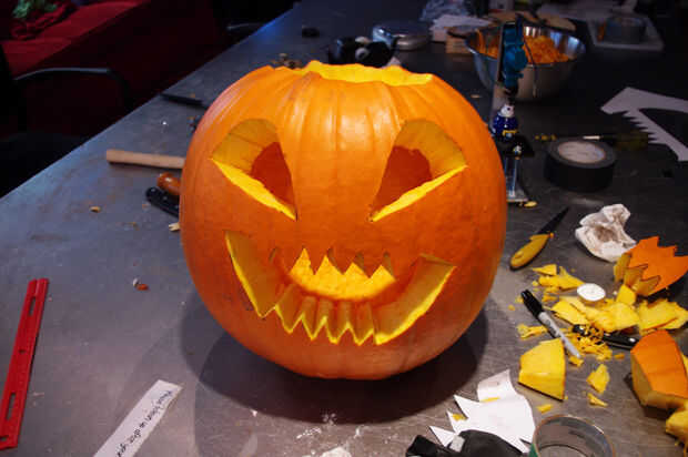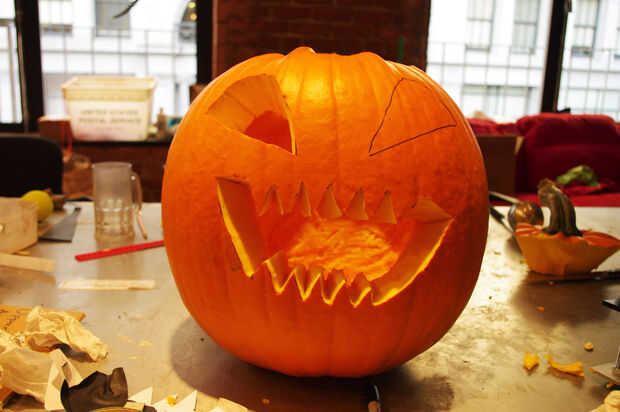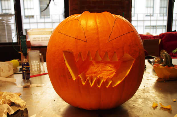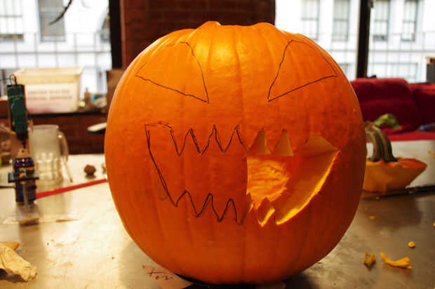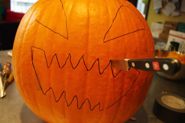 Corte con la cara de la calabaza. Para las formas más grandes y más complicadas como la boca, ayudan a cortar en piezas más pequeñas en lugar de tratar de eliminar una gran parte de la calabaza.