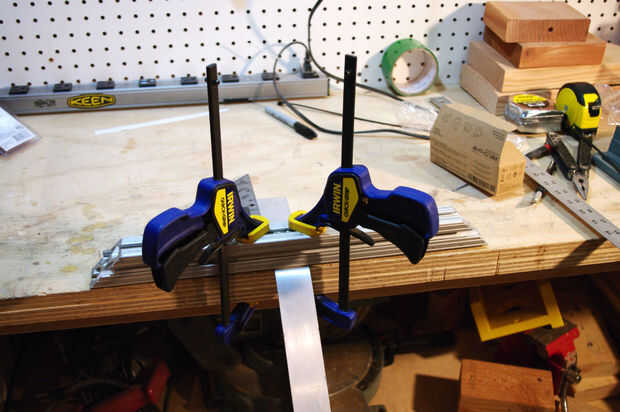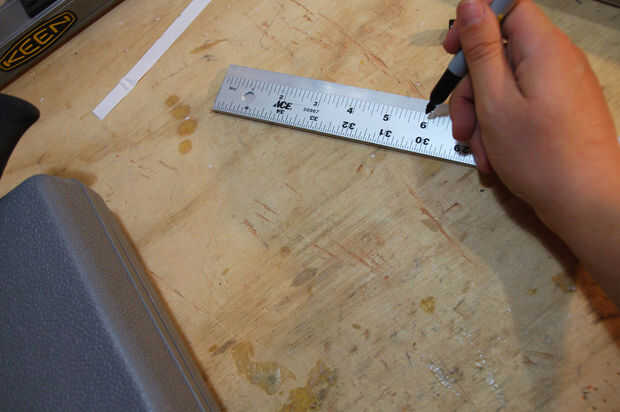 Alinee esta marca con el borde de la mesa de trabajo y sujete entre el Banco de trabajo y algo rígida y plana como una barra de 2 x 4 o de metal.