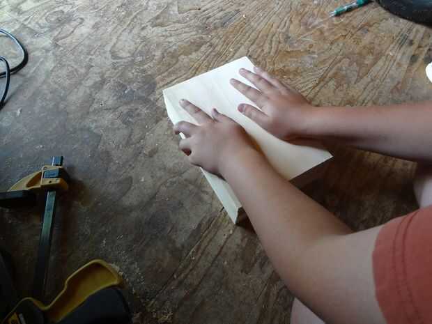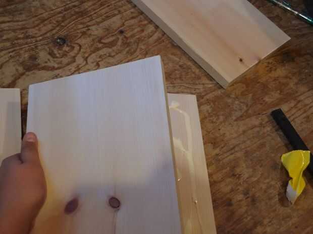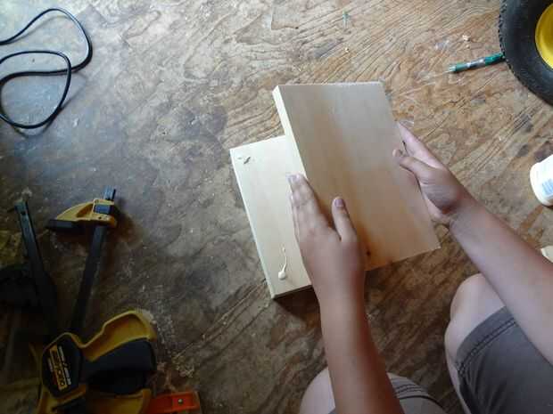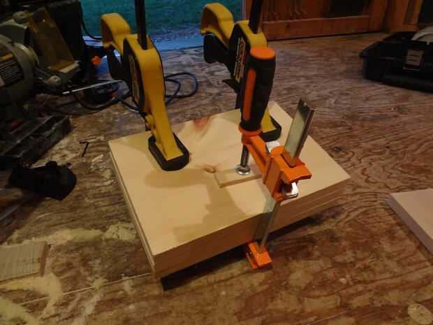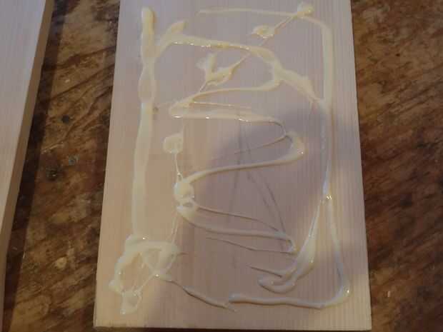 Primero, imprimir la plantilla y recortar el papel. Encontrar alguna tabla de pino que es lo suficientemente amplia como para la plantilla y cortar cuatro pedazos mientras la plantilla. Desde mi sierra de cinta máximo grueso de corte es 3 1/2 pulgadas, tuve que averiguar una forma para quitar la parte posterior de la caja sin cortarlo. La solución, unir tres de las tablas y cuando están secas, coloque el cuarto con un poco de pegamento en cada esquina. Puesto que el pegamento está solamente en las esquinas, la back(fourth board) saldrá una vez que la caja se corta.