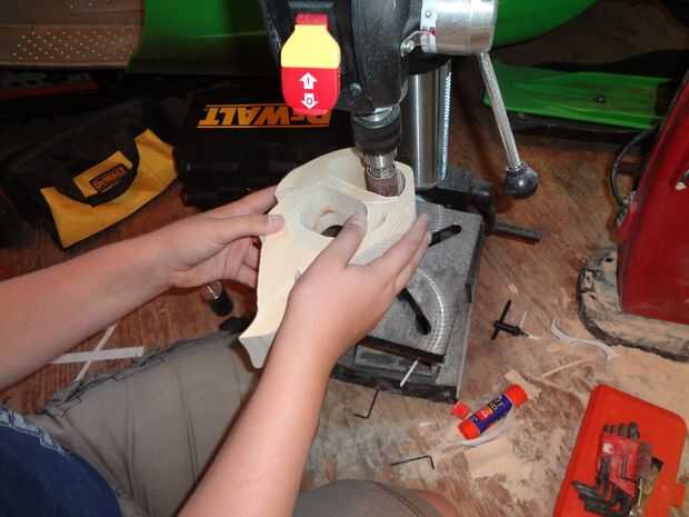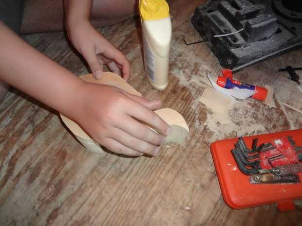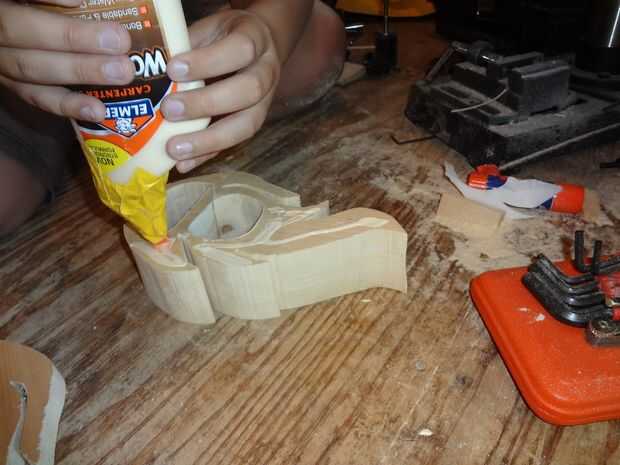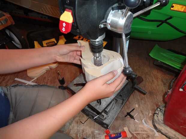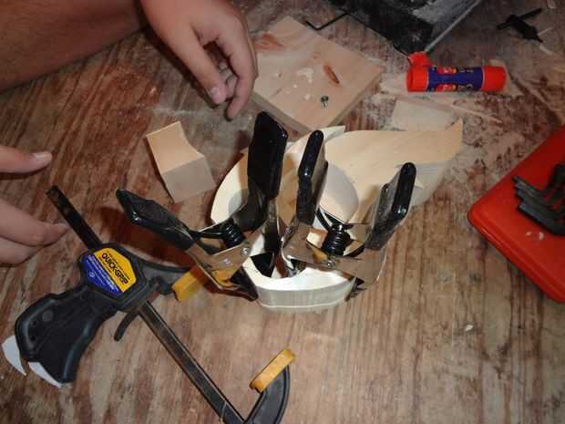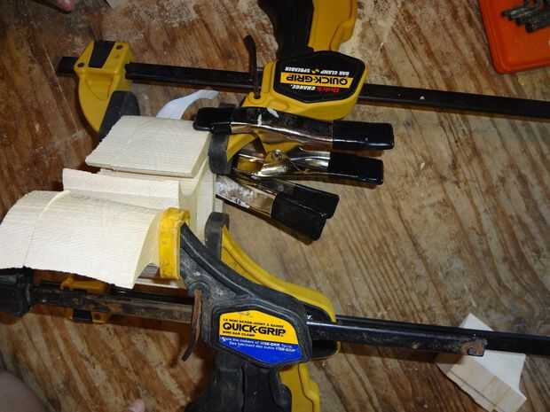 Poner una lijadora de tambor 1 pulgada en el taladro y lije el interior de donde van los cajones. Una vez que esté lo suficientemente suave, pega la pieza posterior en el resto de la caja. Utilice abrazaderas de resorte para cerrar la brecha a la izquierda de cortar los cajones.