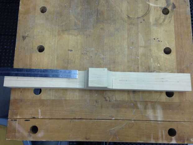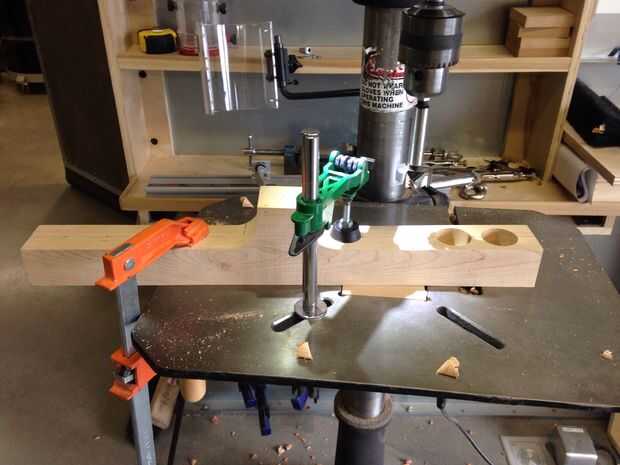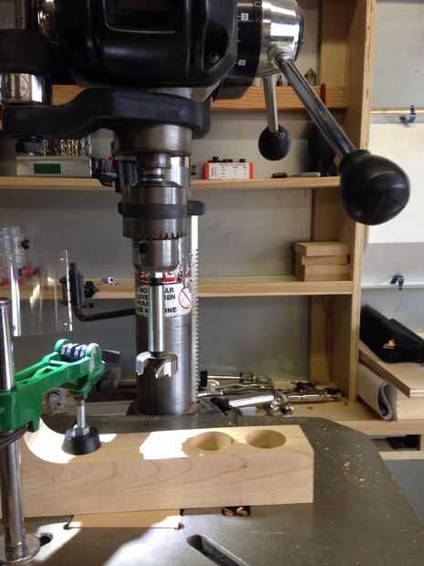 Usando una broca de 1 3/8" forstner, perfore agujeros profundos de 1" a lo largo de la parte superior del bloque de cherry. Utilice la plantilla para encontrar donde cada agujero debe ser perforado. Los centros de cada orificio será 2" aparte.