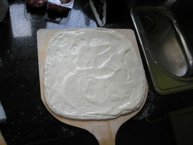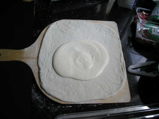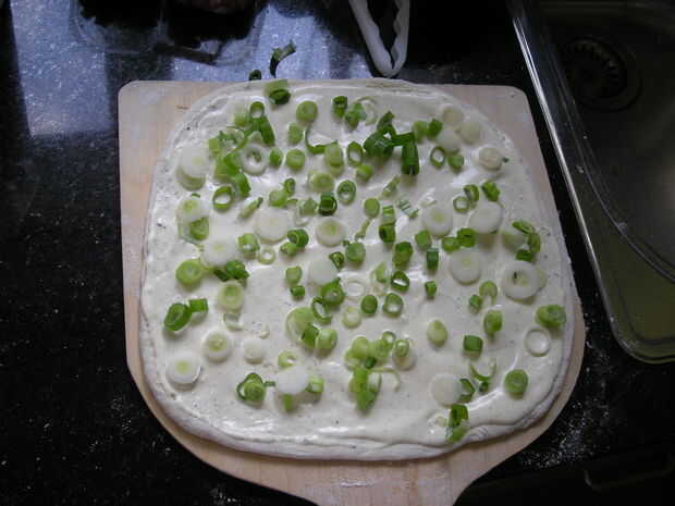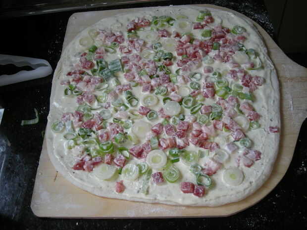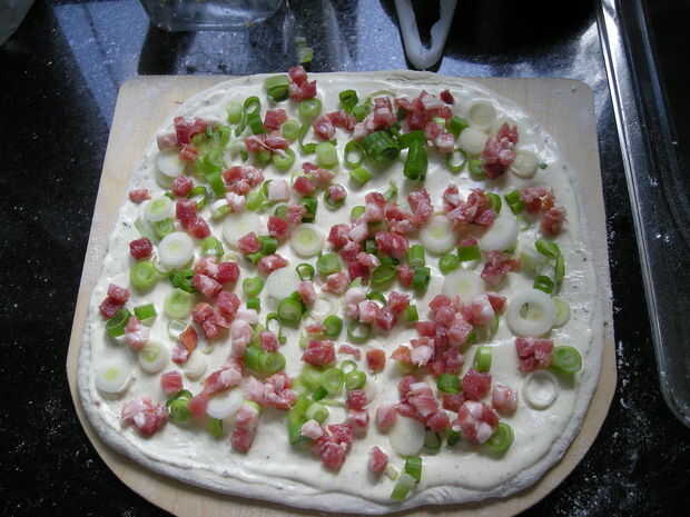 Una corteza de Flammkuchen es bastante delgada, como una pizza napolitana.