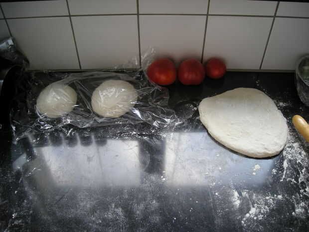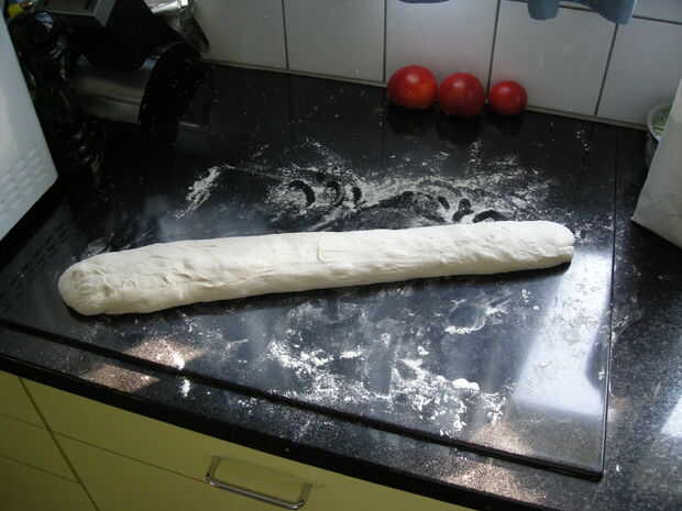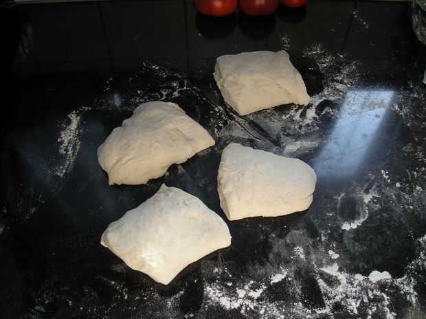Después de que la masa había subido durante 6 horas, tomarlo del bowl y sobre una superficie de trabajo enharinada. (Usted puede prolongar este tiempo, refrigerar la masa