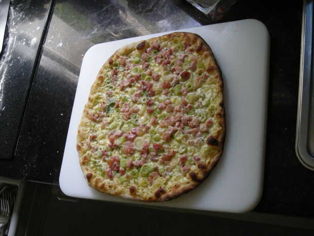 Después de unos 5 minutos en el horno de leña, se hace el Flammkuchen.