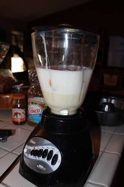 Hora de sacar la licuadora. Me gusta usar una licuadora ya que produce una textura más suave con mitad del esfuerzo de una batidora de mano. Coloque la leche condensada de 14 oz, 4 huevos y 1 taza de leche en la licuadora. Mezclar por aproximadamente un minuto, la mezcla debe ser líquida, un poco más gruesa que la leche.