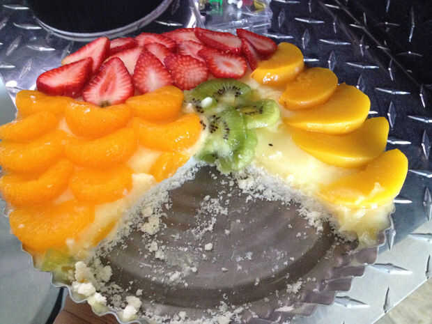 Decorar la parte superior del budín con rodajas de fruta como se muestra.