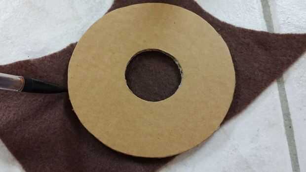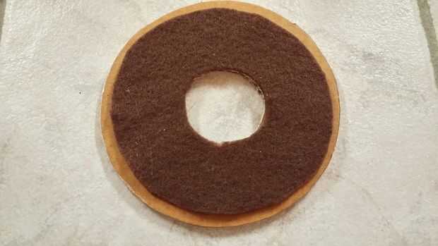 Utilice este cartón "donut" para trazar una forma duplicada en un poco de fieltro. Luego se corta el círculo de fieltro (incluyendo orificio interno). Luego, recortar alrededor del círculo de fieltro de ¼" desde el borde externo, lo que es ligeramente más pequeño que el borde. Fijar el fieltro a un lado.