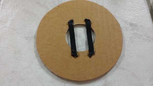 A continuación, coloque pedazos de elástico angosto en todo el círculo íntimo del disco de cartón, como se muestra. Los pedazos de elástico deben ser ligeramente más largos que el agujero. Utilice pegamento caliente para fijar cerca del borde del agujero.