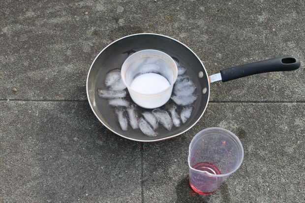 Configuración: Para producir resultados óptimos, el baño de nitrato de potasio ácido sulfúrico debe ser enfriado con hielo y sal. Llene el recipiente/contenedor con hielo, un poco de agua y alguna sal de mesa normal (NaCl). La sal enfría la mezcla a bajo cero y permite que el hielo dure más tiempo. Si la temperatura fuera es dentro de unos pocos grados de congelación, el baño no es necesario.