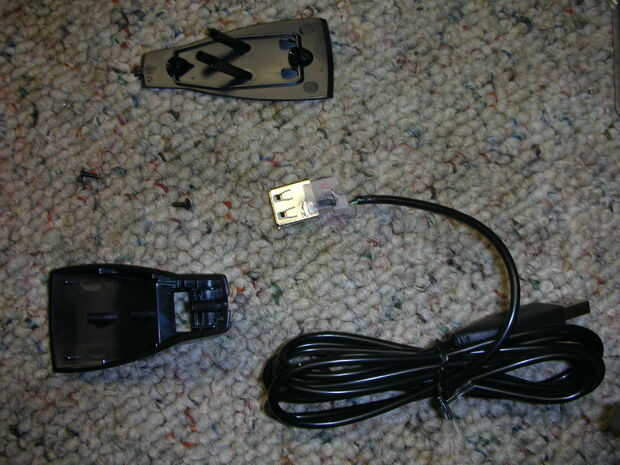Desmontar la extensión USB. Esto puede ser diferente para diferentes extensiones. Mina fue utilizado previamente en un teclado inalámbrico de Logitech y ratón, así que sólo lo destornilla y tomó aparte. Usted puede tiene que despegue el plástico en el suyo para revelar el conector USB.