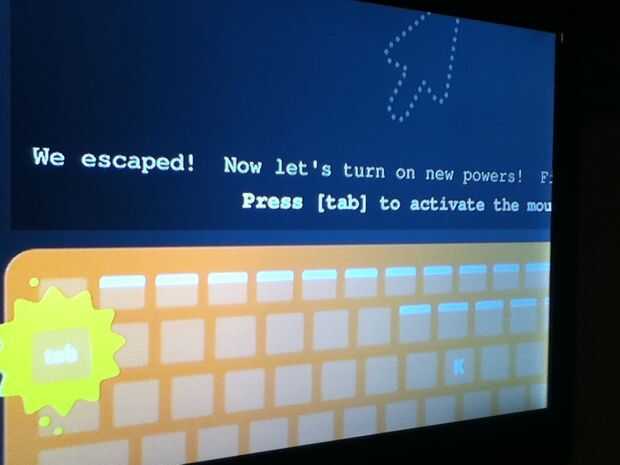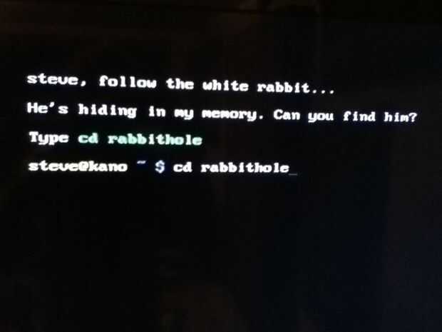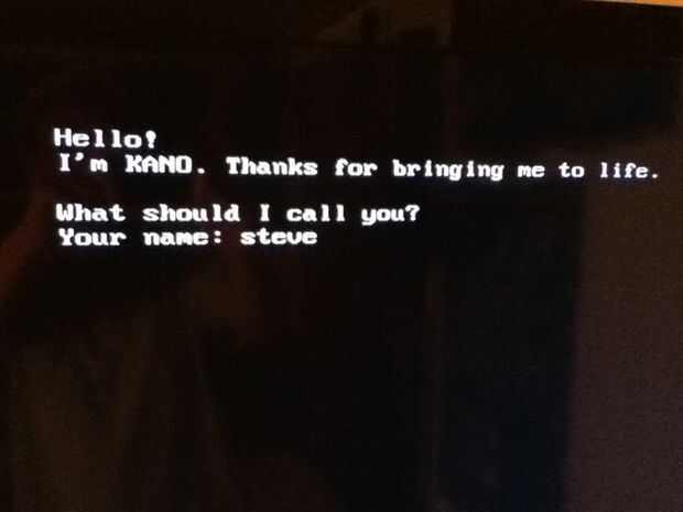 Una vez que hayas montado el equipo de Kano, conecte un extremo del cable HDMI el Kano y el otro extremo a su televisor. Enchufe el Kano en una toma de corriente y cambiar su TV a la entrada HDMI. Como las botas de Kano arriba verá una gran cantidad de texto de desplazamiento hacia abajo la pantalla mientras Kano sistema operativo (OS), un sabor de Linux había llamado "Kanux" (tal vez suena el equipo de hockey de Vancouver?) carga para arriba. El Kano luego le pedirá su nombre.