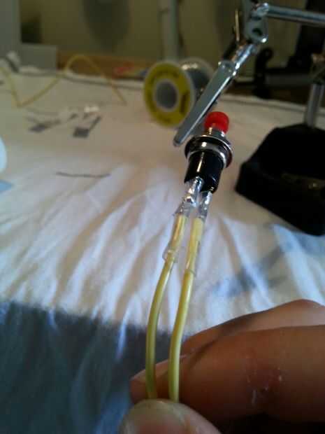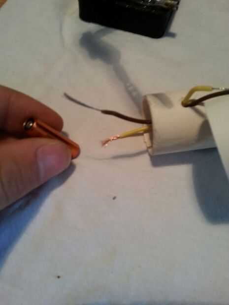 4. una vez que ha hecho esto, consigue un trozo marrón del cable (negativo) y un extremo de la soldadura y alimentación a través del orificio. (imagen 2)