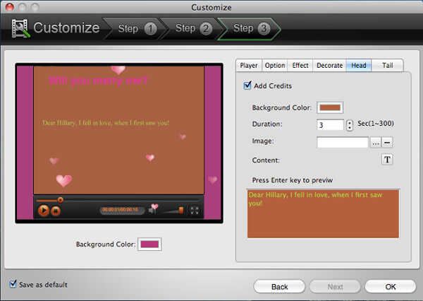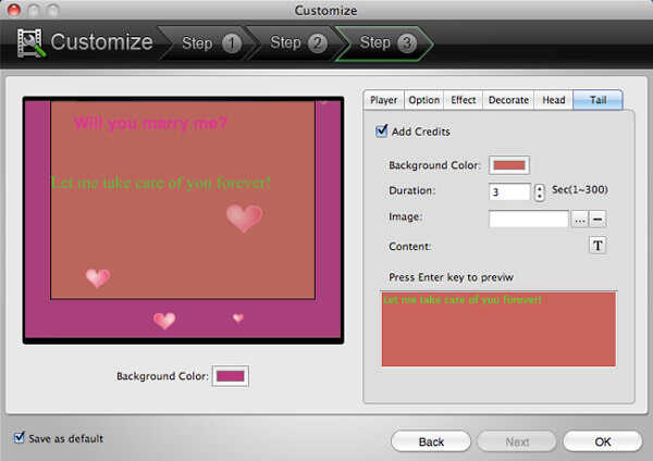 Descargar Video to Flash Converter Mac, añadir tus archivos de vídeo a esta aplicación, haga clic en personalizar en la parte superior de la interfaz, haga clic en siguiente y vaya al paso 3, siga los pasos siguientes para personalizar el reproductor de Flash y Flash video para cada video: