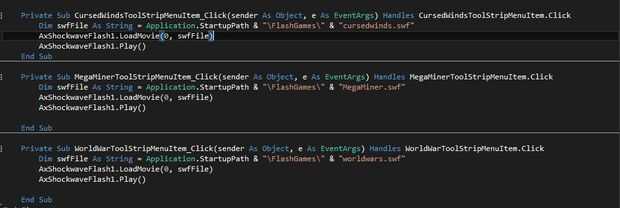 Tenga en cuenta el código después del y señales en la línea Dim será diferentes. Cuando la mina dice "\FlashGames\" se coloca en el directorio donde se encuentran tus juegos. También después de la segunda y la señal, donde mi código dice "cursedwinds.swf", se escriba el nombre de su archivo o juego.