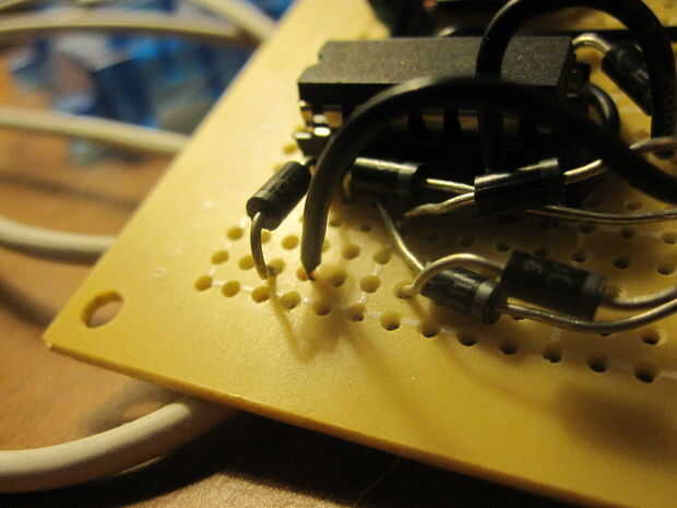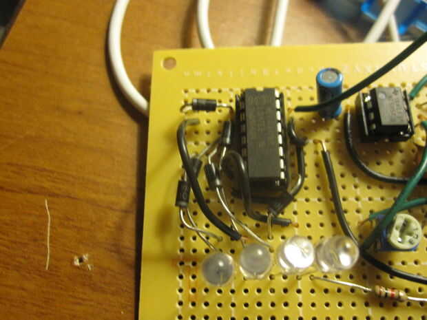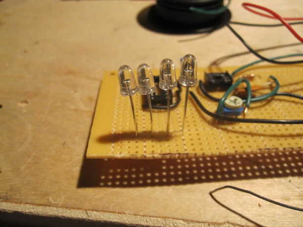 Básicamente todo lo que necesita hacer con los LEDs es conéctelos en el orden correcto para el contador de década. lo único es, usted necesitará alambre 3 de los 4 LEDs a dos de los pines del contador de década y debe conectarse a él a través de diodos para que la electricidad no salta de un perno a otro. Conectar el ánodo del LED al contador de década y conecte todos los cátodos, conectar a tierra a través de una resistencia de 1 k. Si usas 4 LEDs, conecte el primer a los pines 3 y 5 a través de diodos en el contador de década. conectar el otro al pin 2 y 1 a través de diodos en el contador de década. conectar el tercero a los pines 4 y 10 en el contador de década y conecte el cuarto LED al pin 7 en el contador de década (no es necesario un diodo para éste.