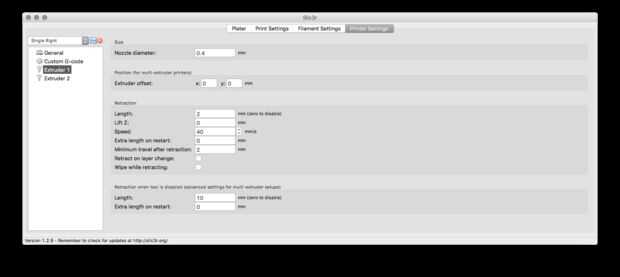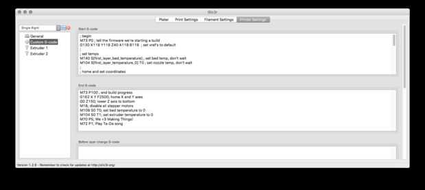 Como se puede ver la gcode es muy similar para cada perfil. El cambio de cosa única es los números de la extrusora (T0 por derecho, T1 para la izquierda) y unas instrucciones de inicio de las boquillas en las coordenadas correctas.
