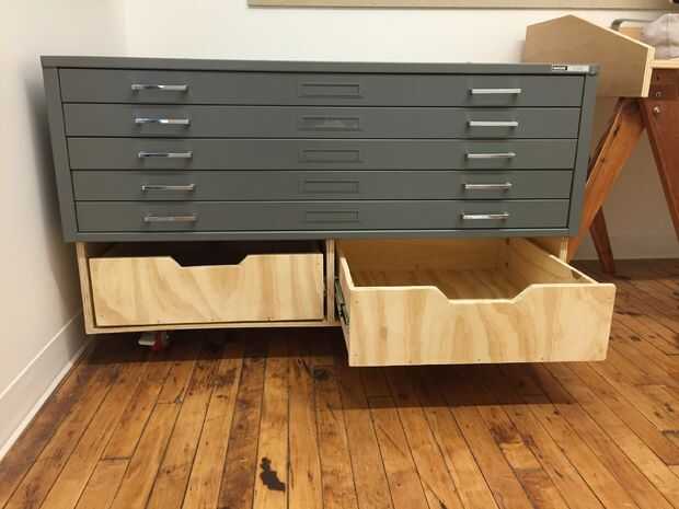 Ella encontró una gran cantidad en un archivo plano en Craigslist. Es una bestia--cerca de cuatro pies de anchos, tres pies de profundos y súper pesados. También no es que altura, tan necesario para elevarlo hacia arriba sobre una base que lo llevaría hasta la altura superior de la tabla, añadir algunos almacenamiento extra para materiales de arte y hacen fácil moverse. La solución fue un simple gabinete sobre ruedas con cajones de madera. El proyecto tomó alrededor de $125 (podría ser también más barato si usted tomó decisiones diferentes material/patas para ruedecilla) y 6 horas para hacer con herramientas simples. Lo hice todo con sólo una sierra circular y un taladro; para el trabajo más rápido, más preciso, una sierra de mesa sería muy útil.