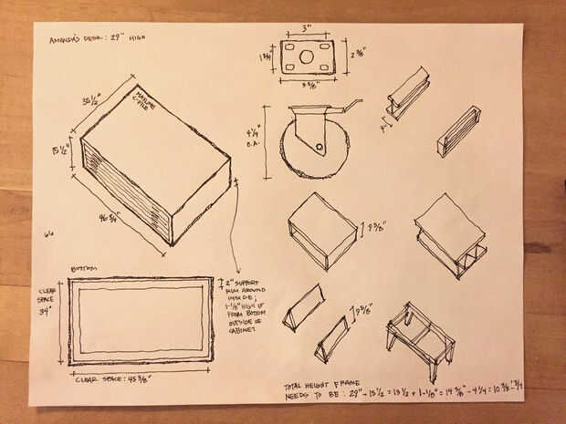 El canal para este gabinete tiene una huella de 45 "x 33 1/2" y está 9-5/8" alta. Esto se calculó para caber dentro de la llanta de metal estampado debajo el archivo plano, que sería la base resbale hacia fuera y, una vez que se montó a las ruedas, traerlo hasta exactamente la misma altura que la mesa vecina. Ajuste de sus dimensiones para ajustar en consecuencia su archivo plano.