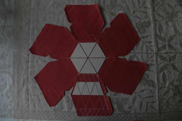 A continuación se pegar las figuras sobre la tela utilizando el pegamento. Me pareció útil para dibujar los espacios de líneas entre los triángulos para que pueda ver exactamente donde tengo que pegar mi triángulo. Esto es importante porque los triángulos permiten el textil doblar en el lugar deseado pero para esto todos los triángulos tienen que pegar más o menos en el mismo lugar en cada parte desdoblada.