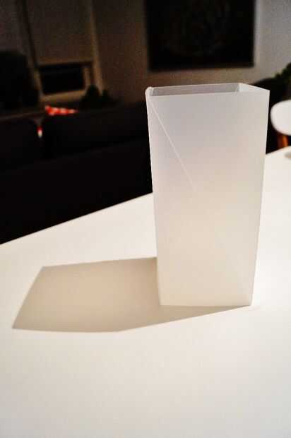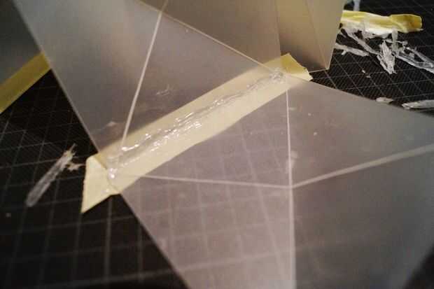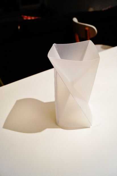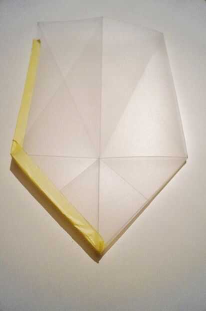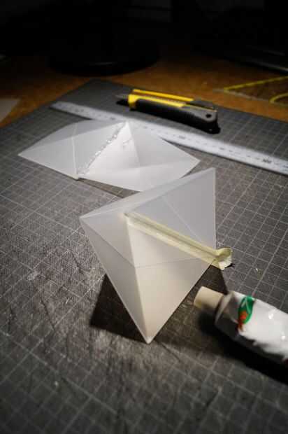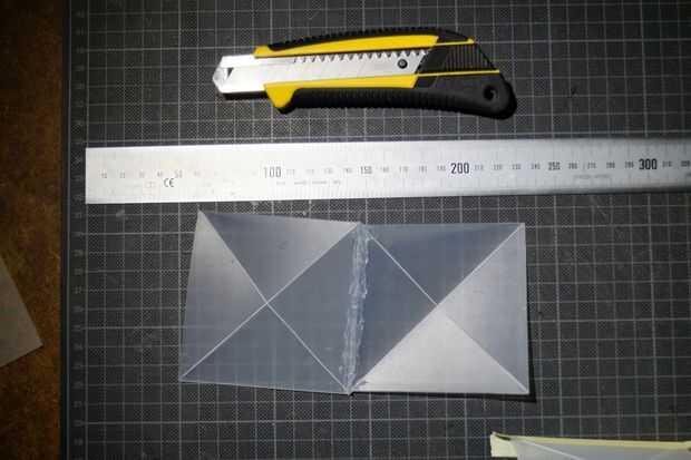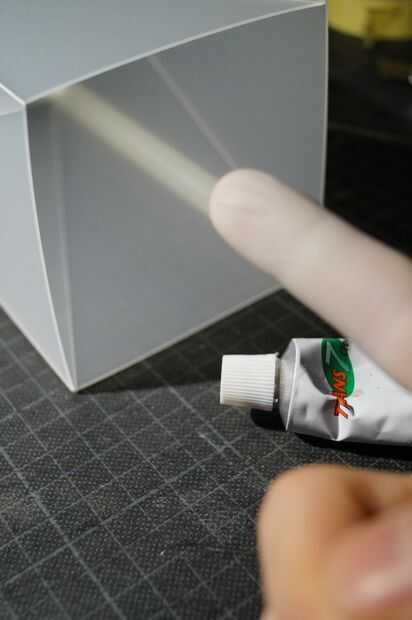 Primero cortamos un rectángulo de 20 cm x 27 cm (4 x 9 cm para cada lado de la olla). Hacemos 4 líneas plegables cada 9 cm dividir el bote de 4 lados. Después girar el rectángulo entero y hacer las 4 líneas de plegado diagonal, cada vez en la misma dirección. Los dos extremos se juntan y se unen con el pegamento de silicona usando la cinta para sostener juntos. Puede usar un condón de dedo frotar uniformemente sobre la longitud entera. Ahora necesita secar.