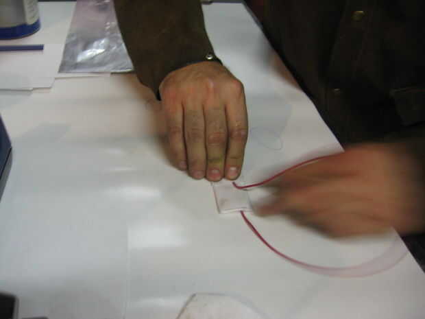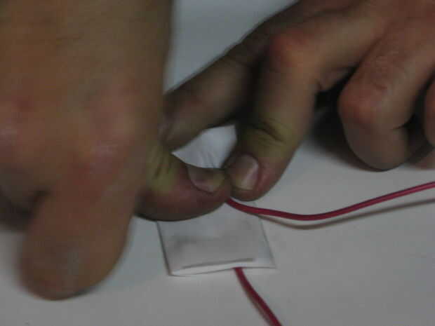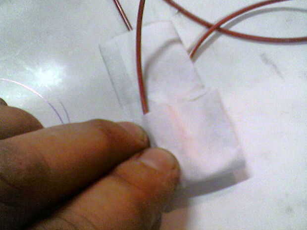 Doblar un extremo de la envoltura, incluyendo el alambre del fusible y cinta adhesiva en su lugar.