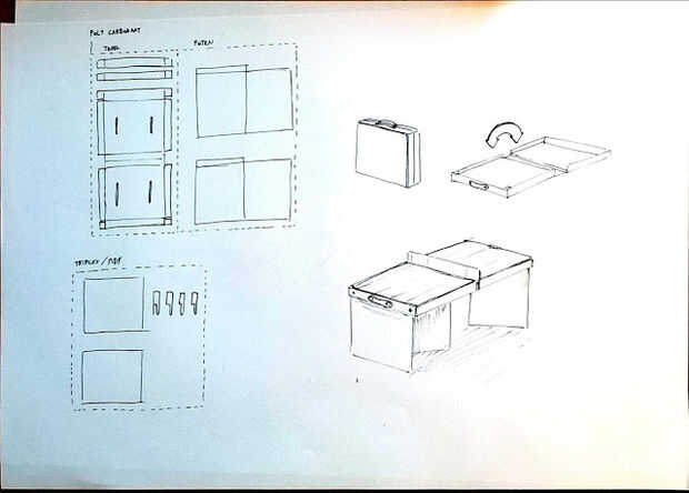 Después de muchos bocetos la superior fue uno de los finales. El modelo final tiene algunas diferencias de menor importancia. La mofa de pequeña fue a buscar el modelo plegable ideal.