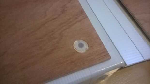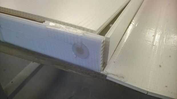 Poner las piezas del remache a través de los 4 agujeros en la hoja de triplex. Después ponga estos 4 agujeros que ha hecho en la parte superior de las hojas de policarbonato y asegúrelo en su lugar. Hacer este paso una vez más.