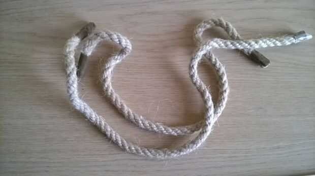 Para los tiradores que necesita para asegurarse de que las piernas están muy bien. Agarra la primera pieza de la cuerda y hacer un nudo en el extremo como se muestra en la fotografía. Ponga el extremo sin nudos a través de los agujeros y atar otro no cuando el hecho. Cortar el extra. Repita este paso para ambos lados.