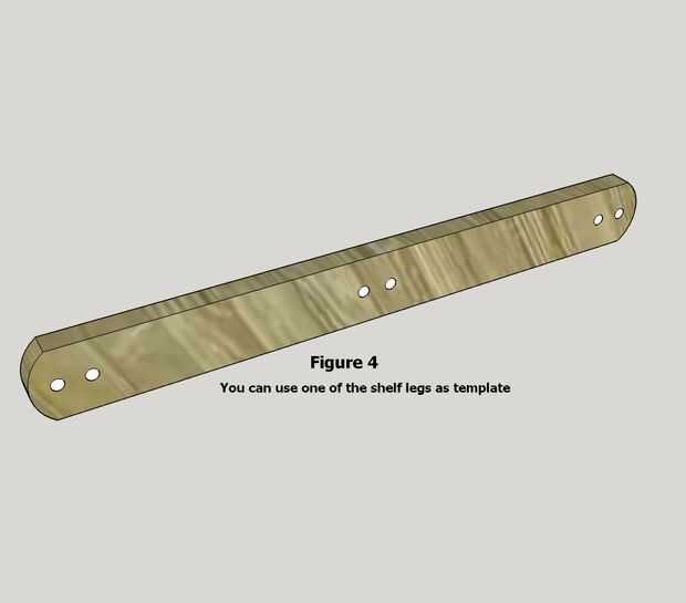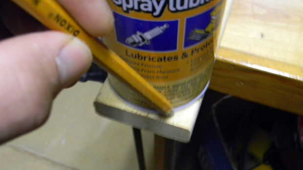 Comienza por cortar las cuatro patas a la longitud. Encontré que la parte inferior de un envase de spray de silicona es ideal para trazar un borde redondo en la madera. Use una sierra de calar para redondear los extremos de la pierna. Marque las posiciones de los tacos en una pierna. Taladre los orificios que marcó.