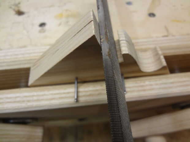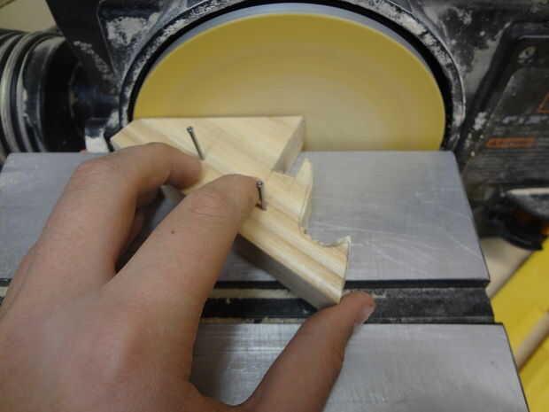 Corte 2 piezas de madera y la forma en la figura 2 en uno de ellos. Clávelos juntos así que cuando usted corta los son idénticos. Use una lijadora de tambor y una lijadora de disco para suavizar los bordes. Archivo de la parte interior de la ranura para hacerla por lo menos 3/8" de ancho para la parte de atrás.