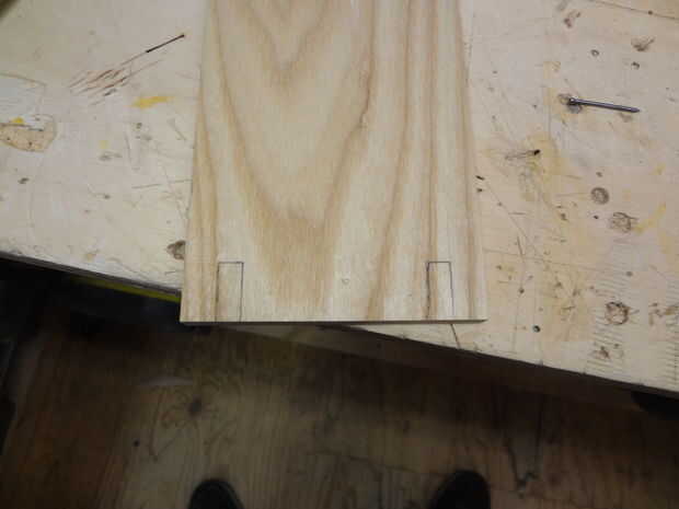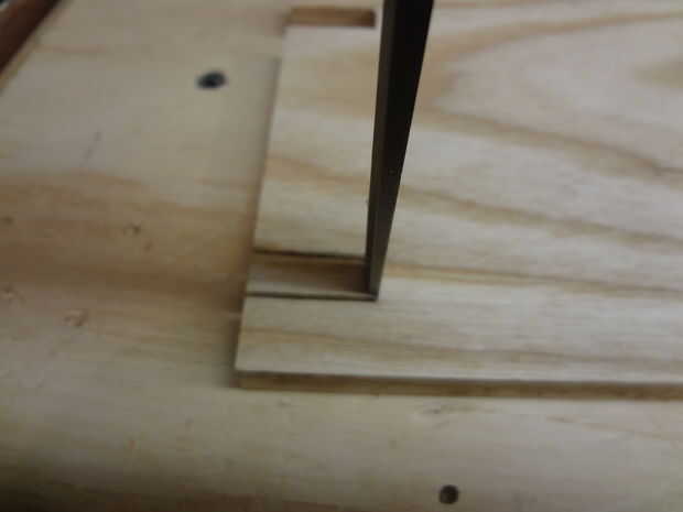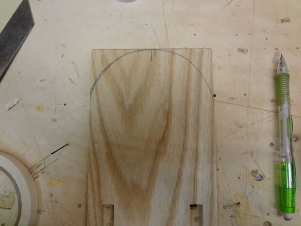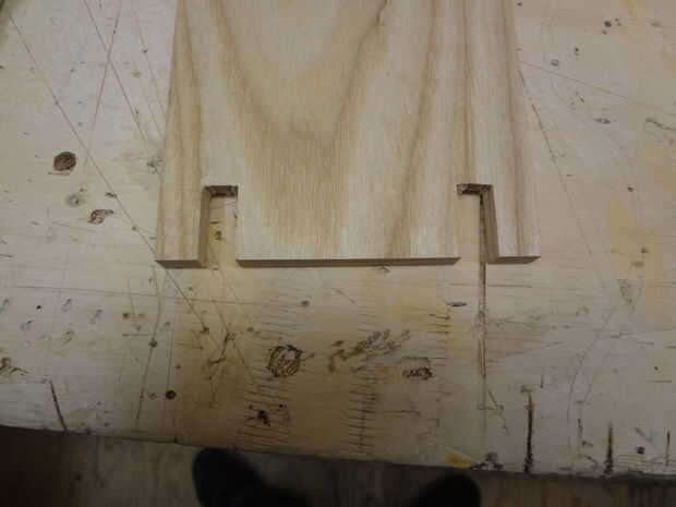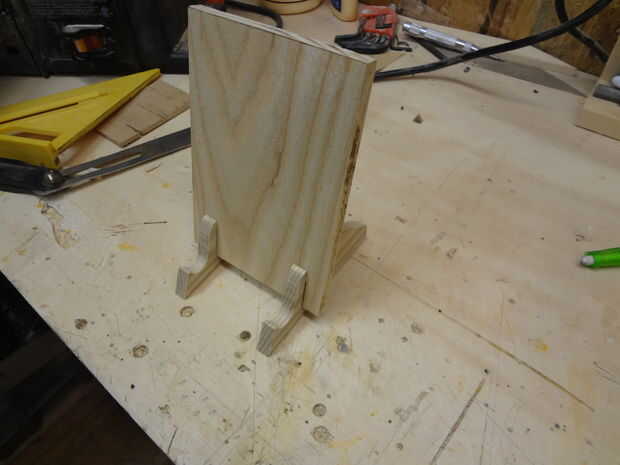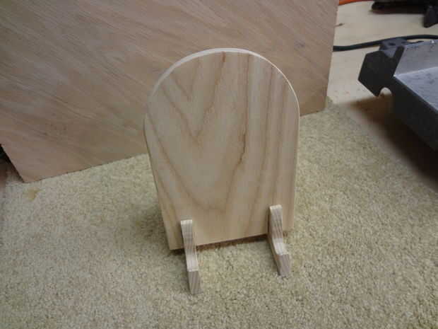 Cortar un trozo de madera que está sobre el tamaño de la tableta. Marque un dado 1/2" en cada lado que es 7/8" largo, 3/8" ancho. Recorto y asegúrese de que el que se ajusta al armar el stand. Si lo desea, puede redondear la parte superior para darle un aspecto agradable. El soporte debe encajar ahora.