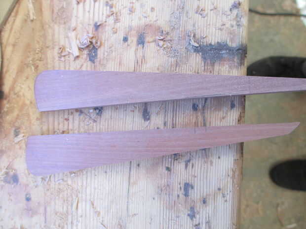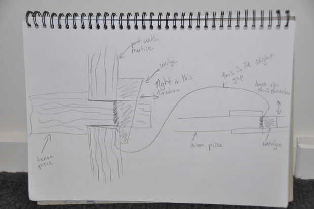 La geometría de una espiga colmillo es una articulación muy fuerte. La mortaja de la cuña se corta a 7 grados. la mortaja es cortada en 1mm detrás de la mortaja grande en la pierna. Esto es para que la cuña cuñas firmemente contra el lado de la pierna. Debe ser un ajuste apretado en la dirección angular, pero deben ser capaces de simplemente caer en la mortaja de un lado a otro. Esto es para que la cuña no dividir la mortaja.