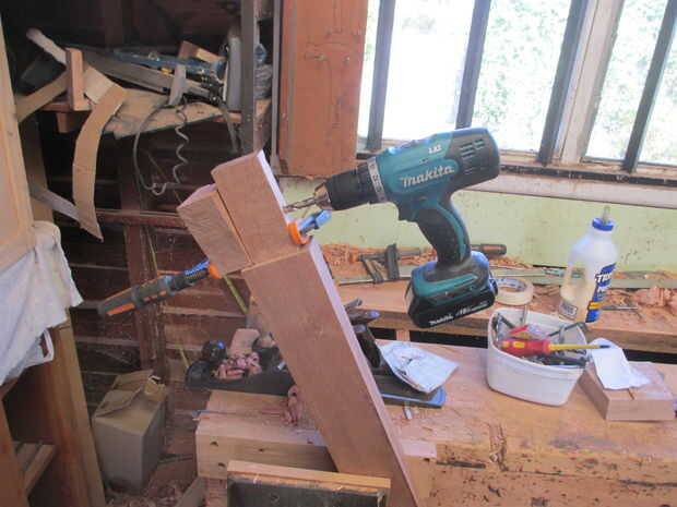 Perforó un agujero a 7 grados y luego limpiar los lados de la mortaja. Hay un montón de grandes videos en YouTube explicando esta articulación. Explican muy bien cómo funciona la articulación y por qué es tan fuerte. Hubo mucho de prueba de ajuste y recorte para obtener este conjunto se adapte correctamente.