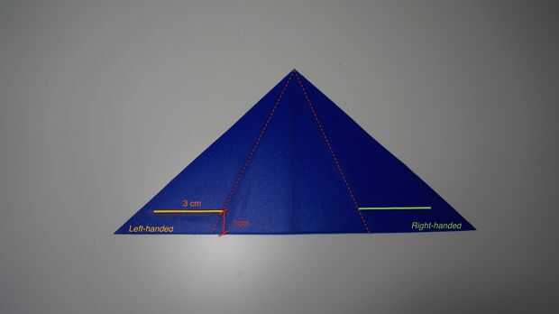 La línea naranja indica la incisión para la colocación de la pluma. Hacer una incisión según la línea naranja. Aquí le damos la línea dibujada en el lado izquierdo del triángulo. Esto es para zurdos. Derecho hacer la incisión en el lado derecho.