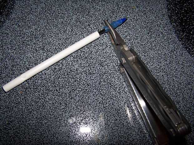 Alicate para sacar la tinta de la pluma. Sostenga la parte de plástico con los alicates. Tienen una servilleta lista en caso de que las fugas de tinta, si lo hace no lo utilice.